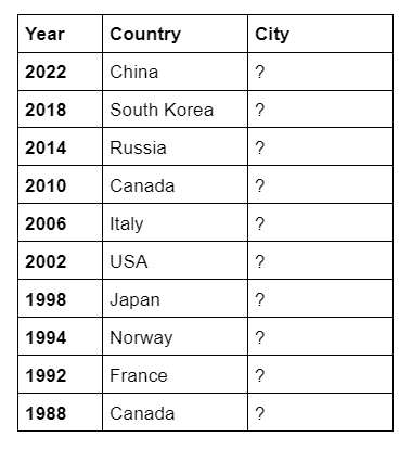 The Winter Olympics are going on now, and we are of course, celebrating with some trivia. This Olympics will take place in the city of Milan, but can you name the cities of the last ten Winter Olympics? We will give you the year, and the name of the country, and you tell us what city the Olympics took place in!
